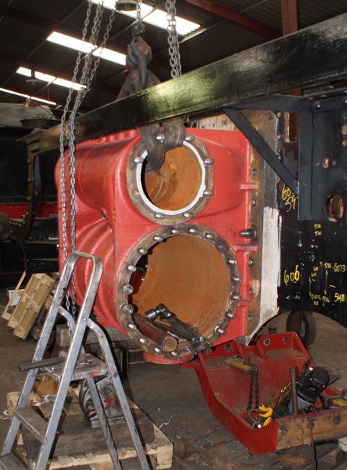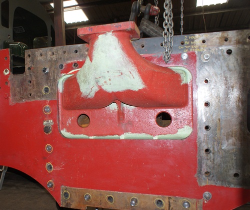 Left hand Cylinder being fitted to the locomotive frames.