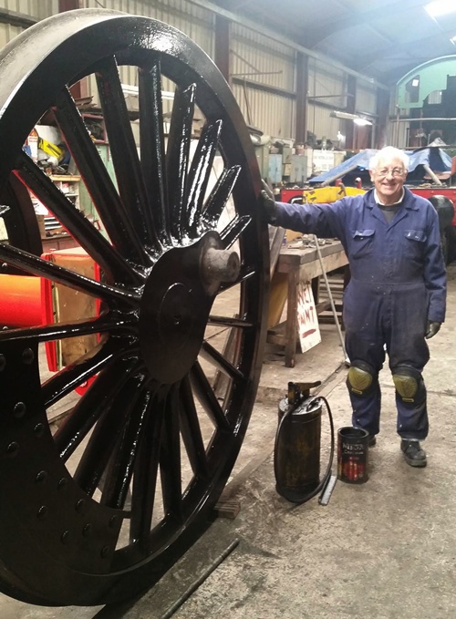 David Hughes who organizes our volunteer working parties stands with the almost complete locomotive Driving Wheels.