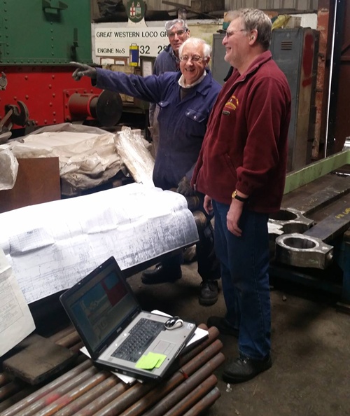 David Hughes points out something to Chief Engineer Kevin West. The boiler tubes for 7822 Foxcote Manor come in handy as a makeshift office desk for the design computer and some original drawings. – Llangollen Works – 2nd June 2015