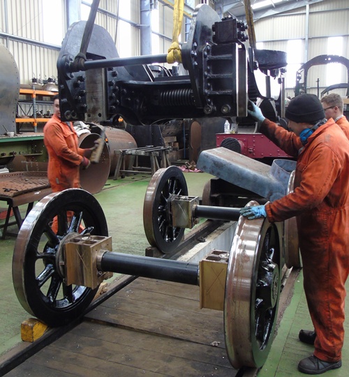 The completed Bogie Frame being lowered onto its wheelsets at Tyseley. Photo – Kevin West