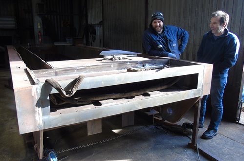 Mathew Walker and Andrew Kennedy from Oakwood Visuals inspect the new Front Drag Box in place at Rowlescourt Engineering on 11th February.. Photo – Kevin West