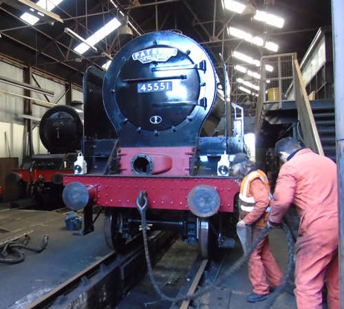 The Unknown Warrior stands alongside fellow LMS express passenger locomotive 6201 Princess Elizabeth at Tyseley Locomotive Works, 4th February. Photo – Kevin West